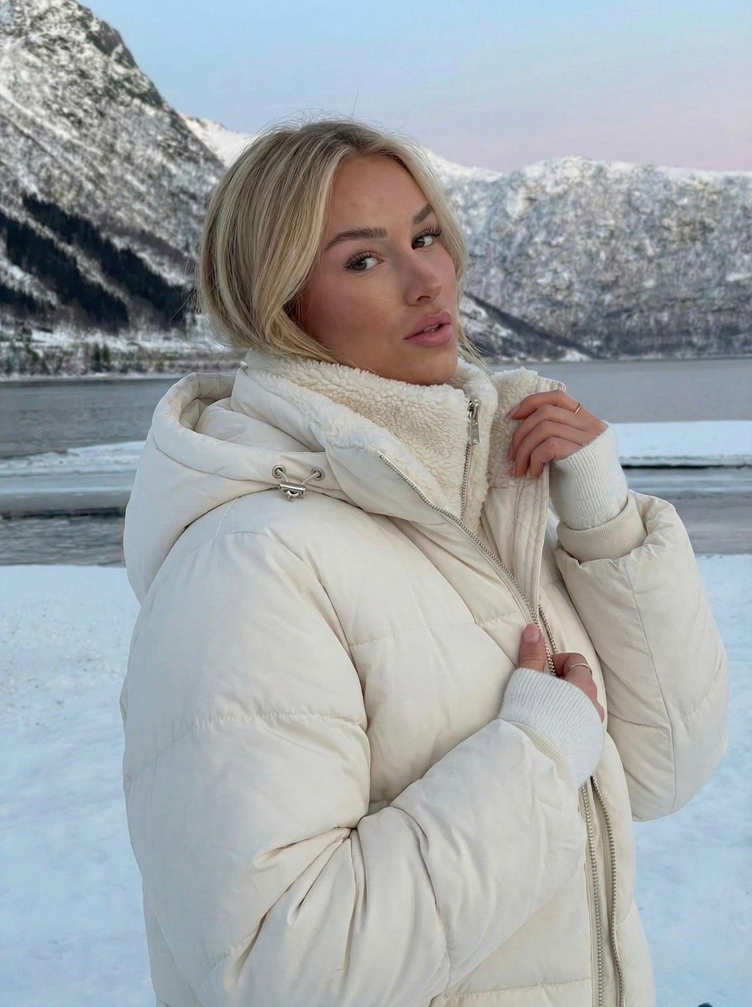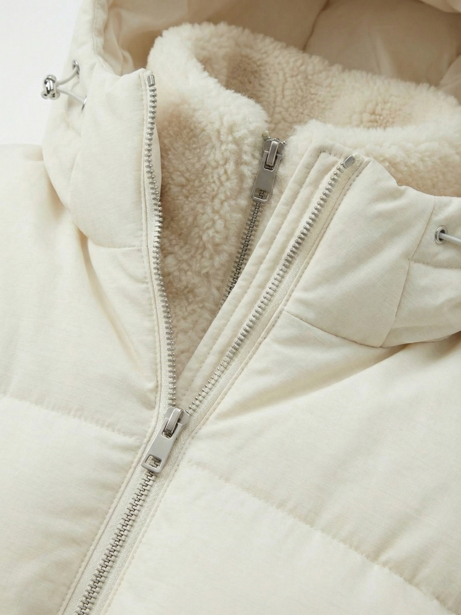 Der durchgehende Reißverschluss vorne, der elastische Saum und die praktischen Taschen erhöhen die Funktionalität, während die lockere Passform das Tragen über Strickwaren oder Freizeitkleidung erleichtert. Diese Jacke ist ideal für kalte Tage in der Stadt und die Übergangszeit und vereint Wärme, Komfort und modernen Stil auf mühelose Weise.
