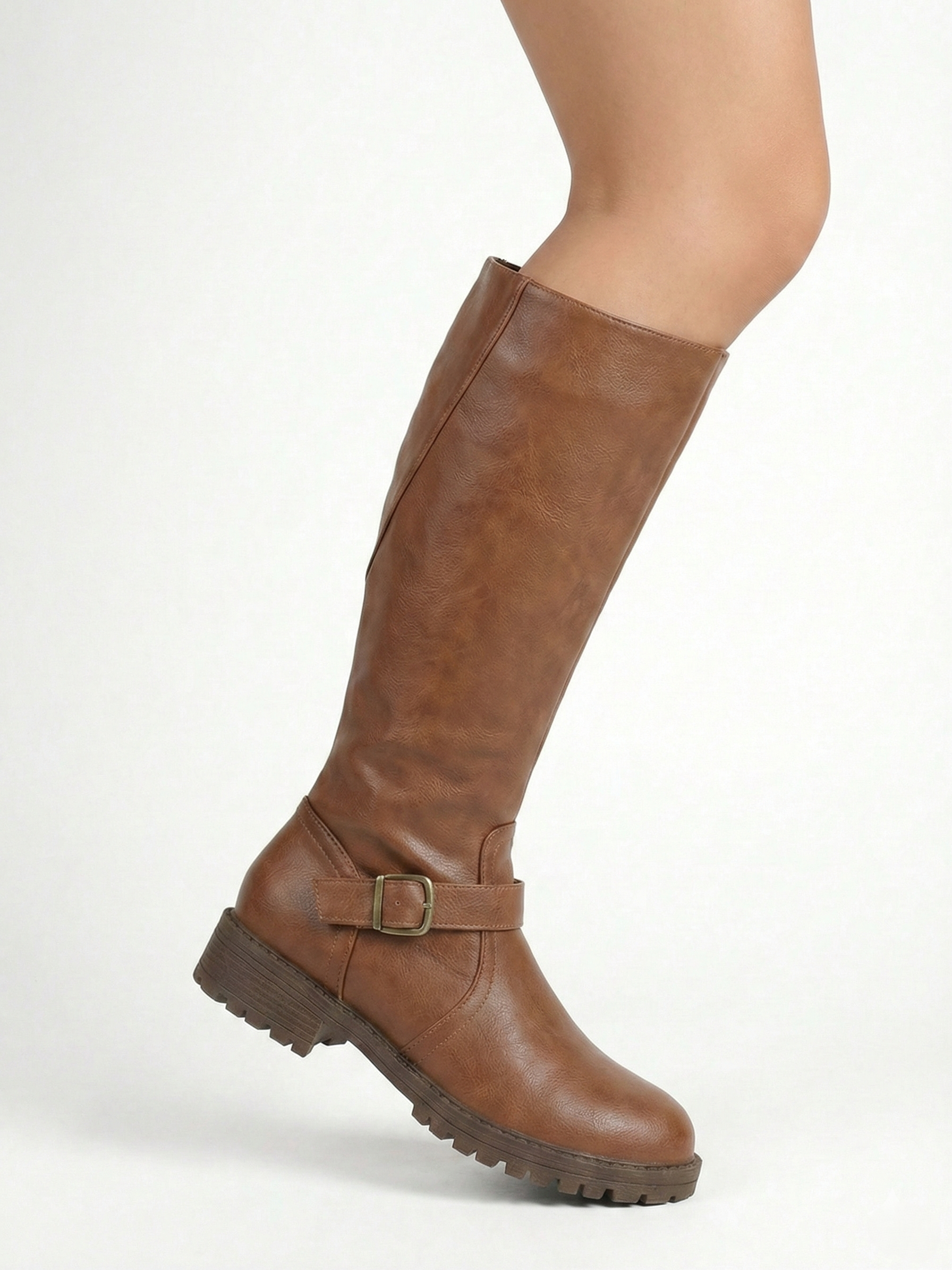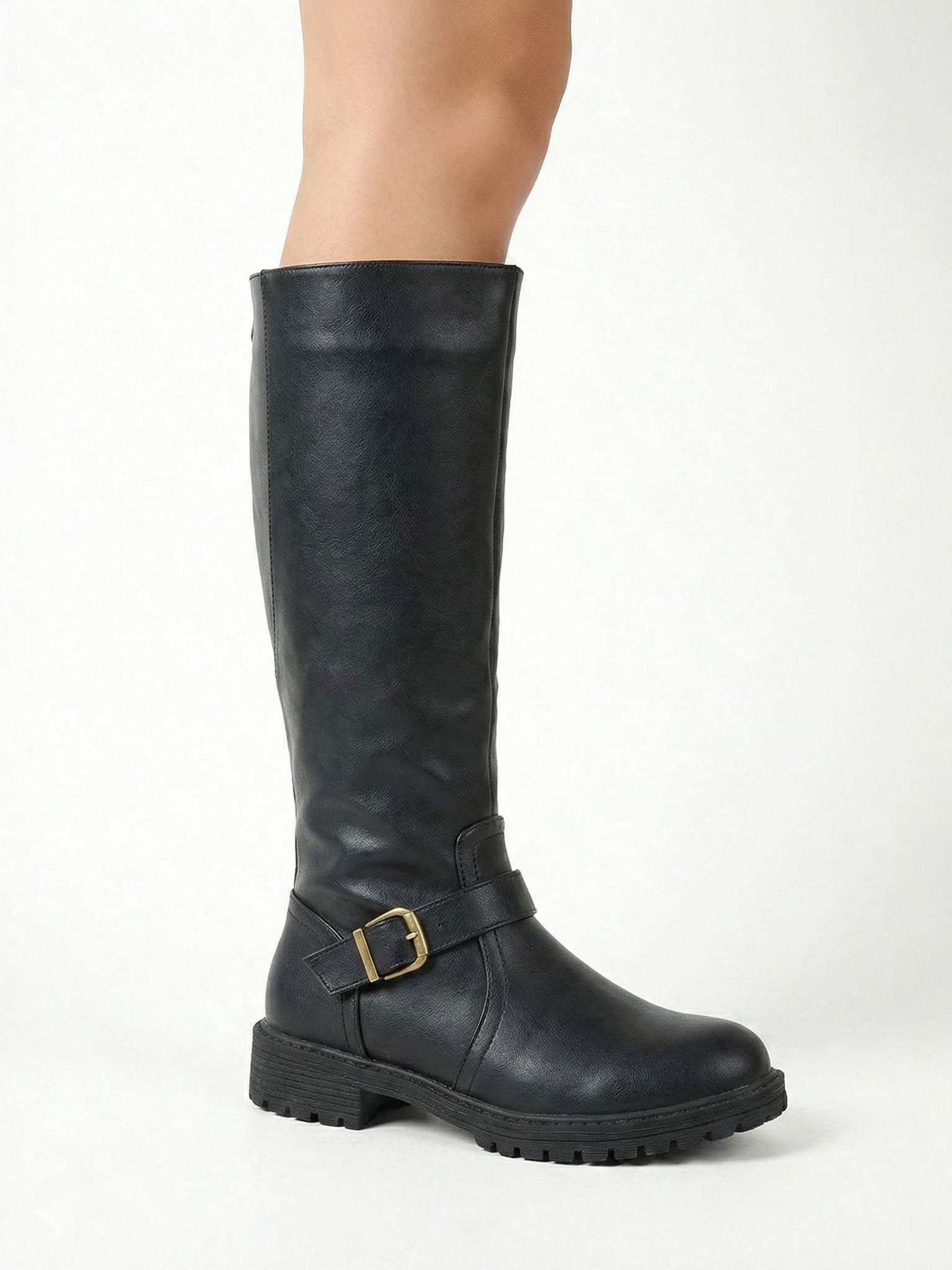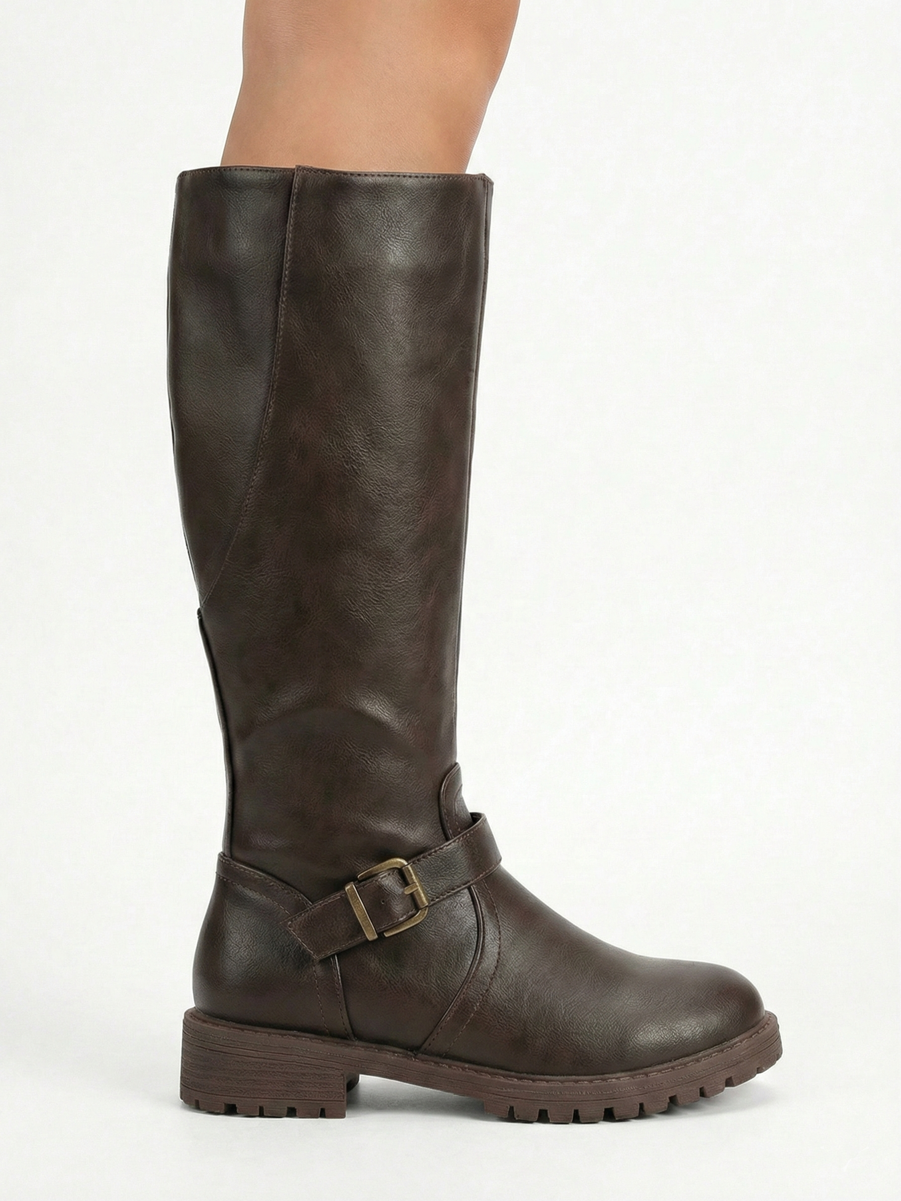 The Belize Buckle Knee-High Riding Boots feature a classic knee-high silhouette with a smooth structured finish and a statement strap-and-buckle detail at the ankle. Designed for everyday winter wear, they combine a sturdy lug sole with a low, stable heel for confident comfort—perfect for city walking, casual layering, and polished cold-weather looks with denim, knits, or midi skirts.