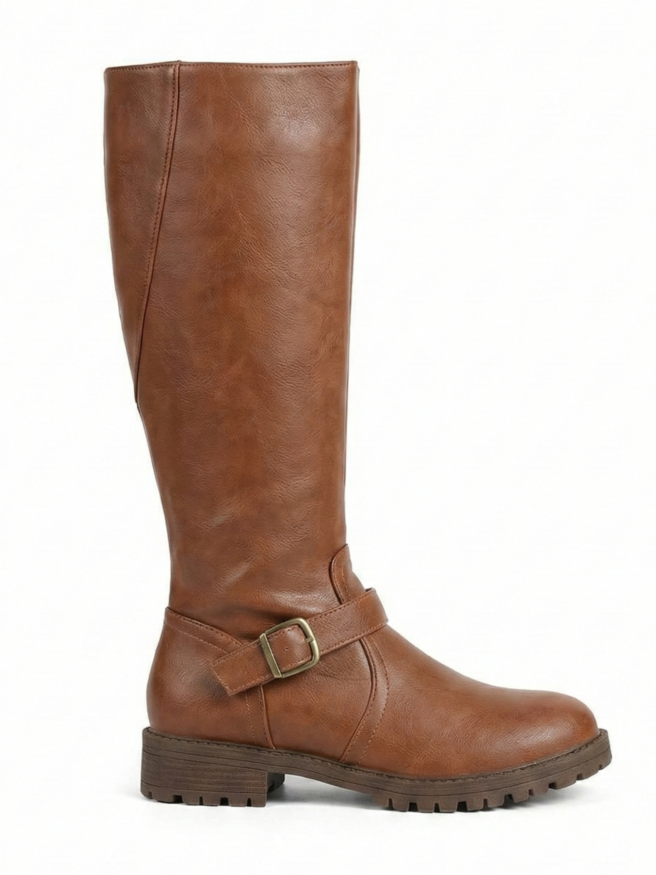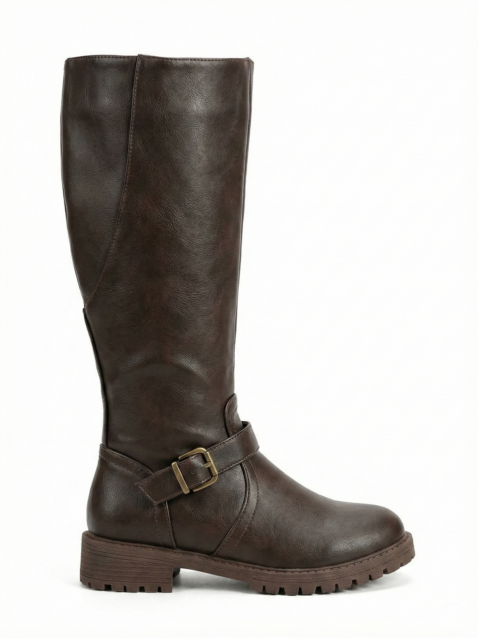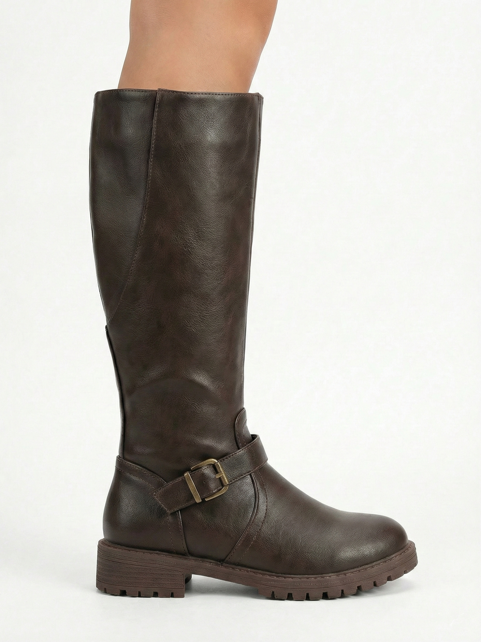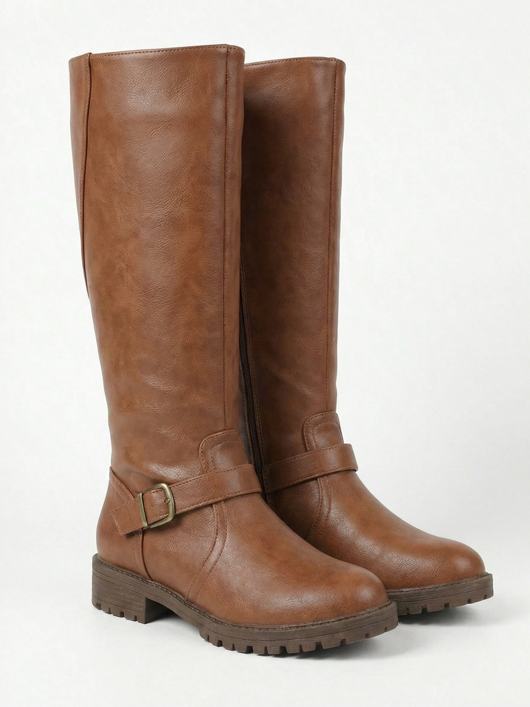 The Belize Buckle Knee-High Riding Boots feature a classic knee-high silhouette with a smooth structured finish and a statement strap-and-buckle detail at the ankle. Designed for everyday winter wear, they combine a sturdy lug sole with a low, stable heel for confident comfort—perfect for city walking, casual layering, and polished cold-weather looks with denim, knits, or midi skirts.