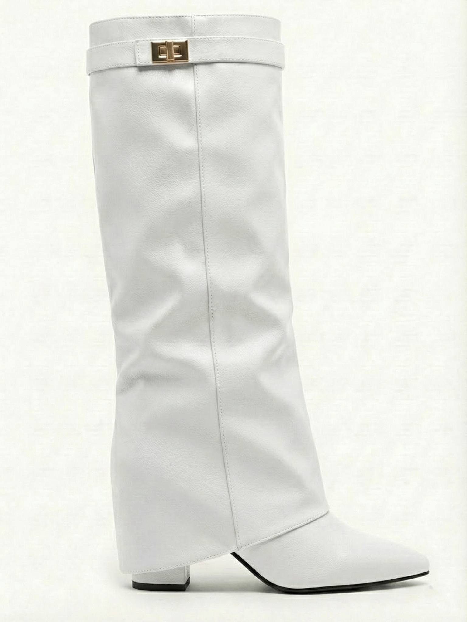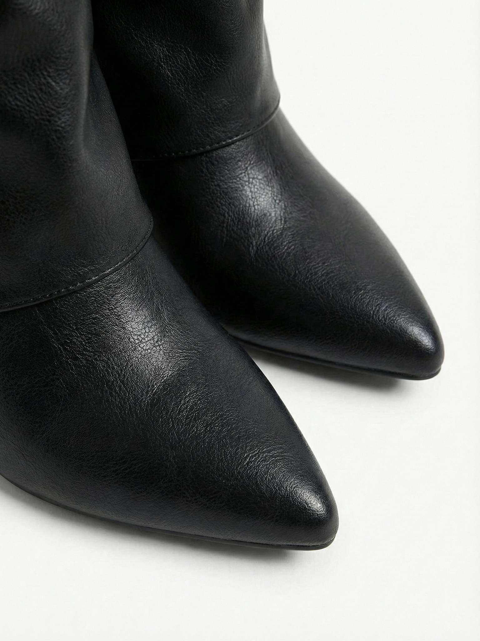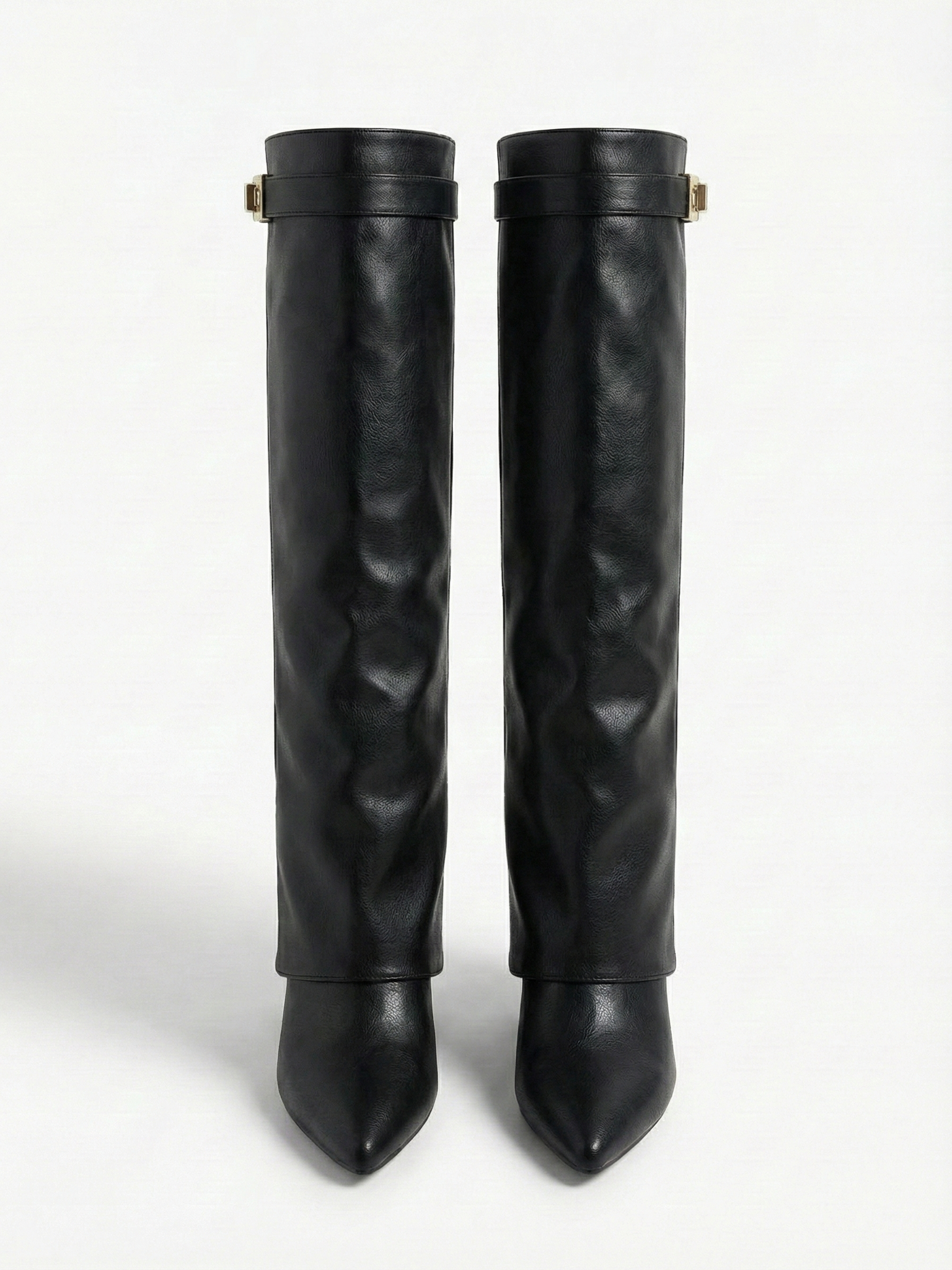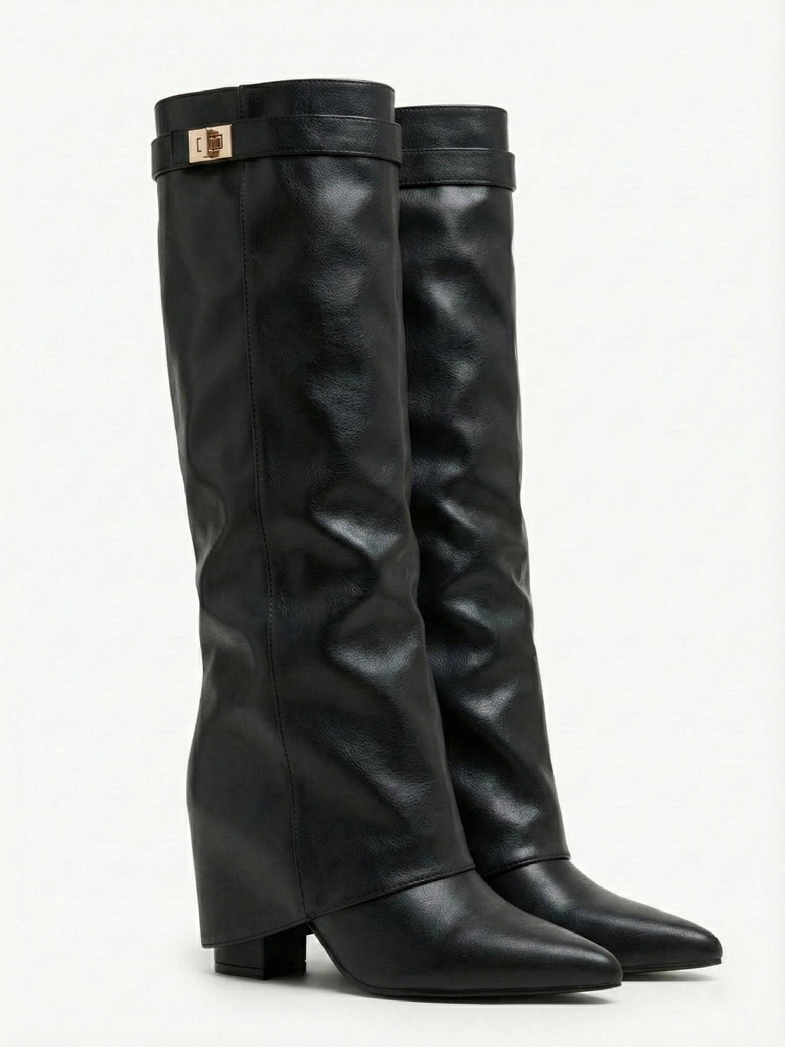 The Leeds Leather High-Slouch Boot delivers a bold, contemporary silhouette with a refined touch. Designed with a structured slouch shaft and a sleek pointed toe, it strikes the perfect balance between elegance and modern edge. The subtle ankle buckle hardware elevates the look, while the stable wedge heel ensures comfort for everyday wear or evening styling.