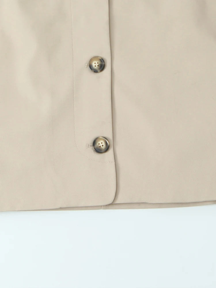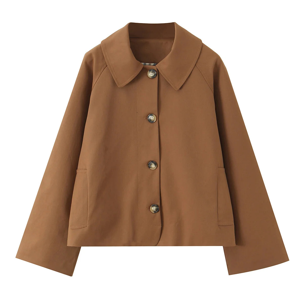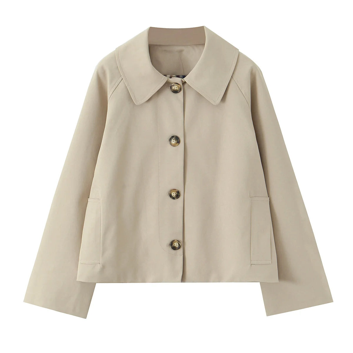 The Robyn Classic Beige Short Trench Jacket embodies timeless sophistication in a clean, modern silhouette. Crafted in a soft yet structured fabric, it features a pointed collar, button-down closure, and minimalist front pockets — offering both functionality and understated elegance.